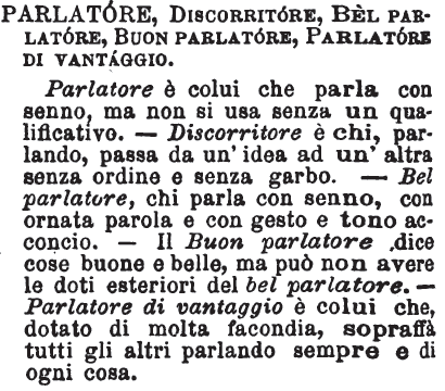 | Parlatore, Discorritore, Bel parlatore, Buon parlatore, Parlatore di vantaggio - Parlatore è colui che parla con senno, ma non si usa senza un qualificativo. - Discorritore è chi, parlando, passa da un'idea ad un'altra senza ordine e senza garbo. - Bel parlatore, chi parla con senno, con ornata parola e con gesto e tono acconcio. - Il Buon parlatore dice cose buone e belle, ma può non avere le doti esteriori del bel parlatore. - Parlatore di vantaggio è colui che, dotato di molta facondia, sopraffà tutti gli altri parlando sempre e di ogni cosa. [immagine] |