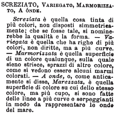 | Screziato, Variegato, Marmorizzato, A onde - Screziata è quella cosa tinta di più colori, non disposti simmetricamente; che se fosse tale, si nominerebbe la qualità e la forma. - Variegata è quella che ha righe di più colori, non diritte, ma a più curve. - Marmorizzata è quella superficie di un colore qualunque, sulla quale sieno strisce, sprazzi di altro colore, come si vedono essere alcuni marmi colorati. - A onde, o, come anticamente si disse, Marezzata, è quella superficie di colore su cui dello stesso colore, ma più cupo, si sono fatte delle linee a più curve e serpeggianti in modo da rappresentare le onde del mare. [immagine] |