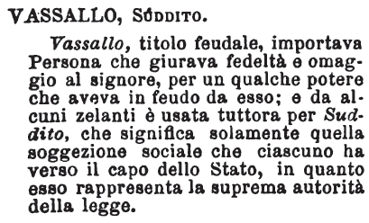 | Vassallo, Suddito - Vassallo, titolo feudale, importava Persona che giurava fedeltà e omaggio al signore, per un qualche potere che aveva in feudo da esso; e da alcuni zelanti è usata tuttora per Suddito, che significa solamente quella soggezione sociale che ciascuno ha verso il capo dello Stato, in quanto esso rappresenta la suprema autorità della legge. [immagine] |