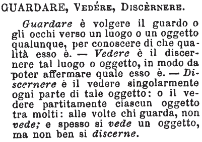 | Guardare, Vedere, Discernere - Guardare è volgere il guardo o gli occhi verso un luogo o un oggetto qualunque, per conoscere di che qualità esso è. - Vedere è il discernere tal luogo o oggetto, in modo da poter affermare quale esso è. - Discernere è il vedere singolarmente ogni parte di tale oggetto: o il vedere partitamente ciascun oggetto tra molti: alle volte chi quarda, non vede; e spesso si vede un oggetto, ma non ben si discerne. [immagine] |
