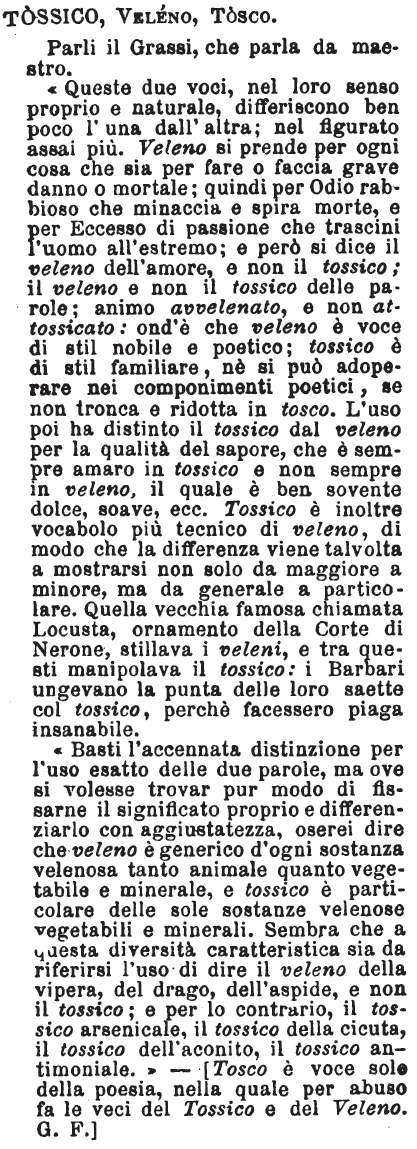 « Queste due voci, nel loro senso proprio e naturale, differiscono ben poco l'una dall'altra; nel figurato assai più. Veleno si prende per ogni cosa che sia per fare o faccia grave danno o mortale; quindi per Odio rabbioso che minaccia e spira morte, e per Eccesso di passione che trascini l'uomo all'estremo; e però si dice il veleno dell'amore, e non il tossico; il veleno e non il tossico delle parole; animo avvelenato, e non attossicato: ond'è che veleno è voce di stil nobile e poetico; tossico è di stil familiare, nè si può adoperare nei componimenti poetici, se non tronca e ridotta in tosco. L'uso poi ha distinto il tossico dal veleno per la qualità del sapore, che è sempre amaro in tossico e non sempre in veleno, il quale è ben sovente dolce, soave, ecc. Tossico è inoltre vocabolo più tecnico di veleno, di modo che la differenza viene talvolta a mostrarsi non solo da maggiore a minore, ma da generale a particolare. Quella vecchia famosa chiamata Locusta, ornamento della Corte di Nerone, stillava i veleni, e tra questi manipolava il tossico: i Barbari ungevano la punta delle loro saette col tossico, perchè facessero piaga insanabile. « Basti l'accennata distinzione per l'uso esatto delle due parole, ma ove si volesse trovar pur modo di fissarne il significato proprio e differenziarlo con aggiustatezza, oserei dire che veleno è generico d'ogni sostanza velenosa tanto animale quanto vegetabile e minerale, e tossico è particolare delle sole sostanze velenose vegetabili e minerali. Sembra che a questa diversità caratteristica sia da riferirsi l'uso di dire il veleno della vipera, del drago, dell'aspide, e non il tossico; e per lo contrario, il tossico arsenicale, il tossico della cicuta, il tossico dell'aconito, il tossico antimoniale. » - [Tosco è voce solo della poesia, nella quale per abuso fa le veci del Tossico e del Veleno. G. F.] [immagine] |