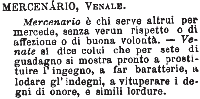 | Mercenario, Venale - Mercenario è chi serve altrui per mercede, senza verun rispetto o di affezione o di buona volontà. - Venale si dice colui che per sete di guadagno si mostra pronto a prostituire l'ingegno, a far baratterie, a lodare gl'indegni, a vituperare i degni di onore, e simili lordure. [immagine] |