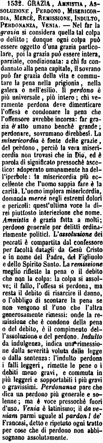 | Perdono, Venia - Perdono è remissione assoluta di peccato o di colpa grave. - Venia è remissione di fallo leggiero. - [Venia è latinismo poco usato negli scritti, e ignoto al popolo; sono però vivissimi, Veniale, Venialità, Venialmente, parlandosi di peccati leggieri e da meritar Venia facilmente. Negli scritti Venia s'usa co' verbi domandare, chiedere e impetrare più spesso che con altri, e quasi mai come nome stante da sè senza reggimento di verbo. G. F.] [immagine] |