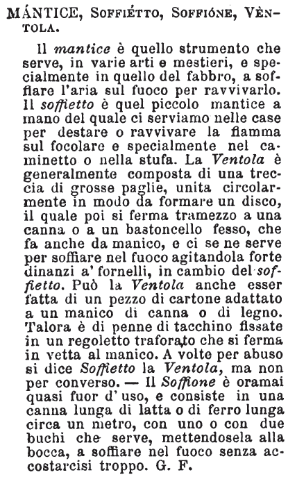 | Mantice, Soffietto, Soffione, Ventola - Il mantice è quello strumento che serve, in varie arti e mestieri, e specialmente in quello del fabbro, a soffiare l'aria sul fuoco per ravvivarlo. Il soffietto è quel piccolo mantice a mano del quale ci serviamo nelle case per destare o ravvivare la fiamma sul focolare e specialmente nel caminetto o nella stufa. La Ventola è generalmente composta di una treccia di grosse paglie, unita circolarmente in modo da formare un disco, il quale poi si ferma tramezzo a una canna o a un bastoncello fesso, che fa anche da manico, e ci se ne serve per soffiare nel fuoco agitandola forte dinanzi a' fornelli, in cambio del soffietto. Può la Ventola anche esser fatta di pezzo di cartone adattato a un manico di canna o di legno. Talora è di penne di tacchino fissate in un regoletto traforato che si ferma in vetta al manico. A volte per abuso si dice Soffietto la Ventola, ma non per converso. - il Soffione è oramai quasi fuor d'uso, e consiste in una canna lunga di latta o di ferro lunga circa un metro, con uno o con due buchi che serve, mettendosela alla bocca, a soffiare nel fuoco senza accostarcisi troppo. G. F. [immagine] |