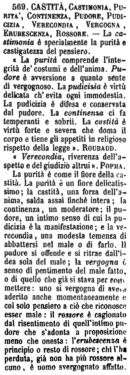 «La purità comprende l'integrità de' costumi e dell'anima. Pudore è avversione a quanto sente di vergognoso. La pudicizia è virtù delicata ch'evita ogni immodestia. La pudicizia è difesa e conservata dal pudore. La continenza ci fa temperanti e sobrii. La castità è virtù forte e severa che doma il corpo e tiene gli appetiti in religioso rispetto della legge ». Roubaud. «Verecondia, riverenza dell'aspetto e del giudizio altrui». Popma. La purità è come il fiore della castità. La purità è un fiore delicatissimo; la castità, una forza dell'anima, salda assai finchè intera; la continenza, un moderatore; il pudore, un intimo senso di cui la pudicizia è la manifestazione; e la verecondia, una modesta temenza di abbattersi nel male o di farlo. Il pudore si offende e si ritrae dall'idea sola del male; la vergogna è senso di pentimento del male fatto, o di quello che già si stava per commettere: uno si vergogna di avere aderito anche momentaneamente e col solo pensiero a ciò che riconosce esser male: il rossore è cagionato dal risentimento di quell'intimo pudore che s'adonta a proposizione meno che onesta: l'erubescenza è principio o resto di rossore; chi l'ha perduta, già non ha più rossore alcuno, è uomo svergognato affatto. [immagine] |
