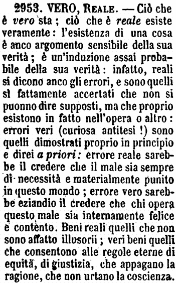 | Vero, Reale - Ciò che è vero sta; ciò che è reale esiste veramente: l'esistenza di una cosa è anco argomento sensibile della sua verità; è un'induzione assai probabile della sua verità: infatto, reali si dicono anco gli errori, e sono quelli sì fattamente accertati che non si puonno dire supposti, ma che proprio esistono in fatto nell'opera o altro: errori veri (curiosa antitesi!) sono quelli dimostrati proprio in principio e direi a priori: errore reale sarebbe il credere che il male sia sempre di necessità e materialmente punito in questo mondo; errore vero sarebbe eziandio il credere che chi opera questo male sia internamente felice e contento. Beni reali quelli che non sono affatto illusorii; veri beni quelli che consentono alle regole eterne di equità, di giustizia, che appagano la ragione, che non urtano la coscienza. [immagine] |