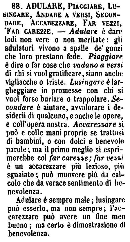 Adulare è sempre male, lusingare può esserlo, ma non sempre; l'accarezzare può avere un fine men buono; ma certo è dimostrazione di benevolenza. [immagine] |