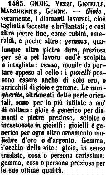 | Gioie, Vezzi, Gioielli, Margherite, Gemme - Gioie, veramente, i diamanti lavorati, cioè tagliati a faccette e brillantati; e così altre pietre fine, come rubini, smeraldi, e poche altre: gemma, qualunque altra pietra dura, preziosa per sè o pel lavoro ond'è scolpita e intagliata: vezzo, monile da portare appeso al collo: i gioielli possono essere anche di solo oro, o arricchiti di gioie e gemme. Le margherite, altrimenti dette perle orientali, sono per lo più infilate a mo' di collana: gioie è generico per diamanti e pietre preziose, sciolte o incastonate in gioielli: gioielli è generico per ogni altro ornamento muliebre d'oro o d'argento. Gemma, l'occhio della vite: gioia, in senso traslato, cosa o persona carissima; gemma, cosa o persona preziosa per le sue ottime qualità. [immagine] |