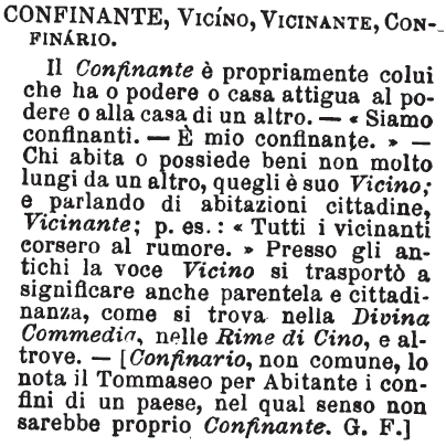 | Confinante, Vicino, Vicinante, Confinario - Il Confinante è propriamente colui che ha o podere o casa attigua al podere o alla casa di un altro. - «Siamo confinanti. - E' mio confinante.» - Chi abita o possiede beni non molto lungi da un altro, quegli è suo Vicino; e parlando di abitazioni cittadine, Vicinante; p. es.: «Tutti i vicinanti corsero al rumore.» Presso gli antichi la voce Vicino si trasportò a significare anche parentela e cittadinanza, come si trova nella Divina Commedia, nelle Rime di Cino, e altrove. - [Confinario, non comune, lo nota il Tommaseo per Abitante i confini di un paese, nel qual senso non sarebbe proprio Confinante. G. F.] [immagine] |