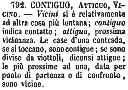 | Contiguo, Attiguo, Vicino, Prossimo - Contiguo indica contatto, e che l'una cosa appoggiasi con un lato sull'altra. - « La mia casa è contigua alla sua. » - Quando non c'è contatto immediato, ma non c'è altra cosa framezzo, allora si dice Attiguo. - La voce Vicino è relativa a cosa più lontana: Pistoja è vicina a Firenze, se ha relazione con Roma, che è molto più lontana. - Prossimo indica vicinanza assoluta, e vicinanza con piccolissimo spazio di distanza. [immagine] |