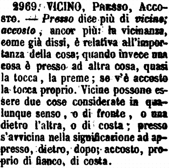 | Accanto, Accosto, Appresso, Presso, Vicino, Lungo, Rasente - Accanto accenna vicinanza dall'uno de' canti. Accosto, accenna vicinanza maggiore, quasi di cosa che ci sia alle coste. - « La chiesa è accanto a casa mia. - Sta sempre accosto a me. » - Appresso e Presso, accennano distanza breve, ma relativamente. - « Un paesello appresso, o presso Firenze. » - Vicino dà idea di lontananza maggiore, ma sempre relativa. - « Siedi vicino a me. - Rifredi è vicino a Firenze. » - Lungo accenna vicinanza, ma per ispazio continuato. - « Passeggio lungo il Mugnone. » - Rasente, infine, accenna la maggior vicinanza, quasi dica che si rade la cosa a cui siamo vicini. - « Camminava rasente al muro per non cader nel burrone. » [immagine] |
