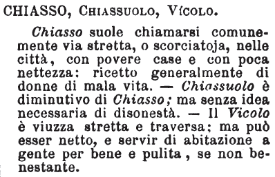 | Chiasso, Chiassuolo, Vicolo - Chiasso suole chiamarsi comunemente via stretta, o scorciatoja, nelle città, con povere case e con poca nettezza: ricetto generalmente di donne di mala vita. - Chiassuolo è diminutivo di Chiasso; ma senza idea necessaria di disonestà. - Il Vicolo è viuzza stretta e traversa; ma può esser netto, e servir di abitazione a gente per bene e pulita, se non benestante. [immagine] |
