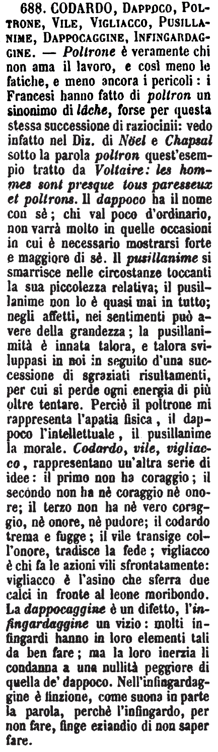 | Codardo, Vile, Vigliacco, Poltrone, Dappoco, Pusillanime - Vile è chi per natura o per educazione non si sente animo bastante a niuna opera di qualche momento, e che ad ogni piccolo ostacolo si spaventa, ad ogni minaccia si impaurisce e si umilia, anche con iscapito del proprio decoro. - Vigliacco è il Vile nel più estremo grado della sua abjezione. Poltrone è colui, che per amore del proprio comodo, o per amore della propria quiete, nulla osa: in tutto vede il pericolo, e si astiene dal bene, e anche trasanda il dovere, per non incappare in qualche guajo. - Dappoco è colui che avrebbe il desiderio di far cosa buona: ma che per difetto di mente o per imperizia, non approda a nulla o a ben poco. - Pusillanime è chi vede il bene e lo vorrebbe, ma che non si sente forza da ciò, e si astiene da ogni atto buono, per paura di non riuscire. - Codardo infine si riferisce più che altro, a quelle cose che riguardano il dovere, la generosità, l’esercizio delle armi, e simili; e Codardo è colui che per viltà di cuore, o per malizia di mente, fa getto del proprio decoro là appunto dove dovrebbe mostrare la propria generosità e il proprio valore. [immagine] |