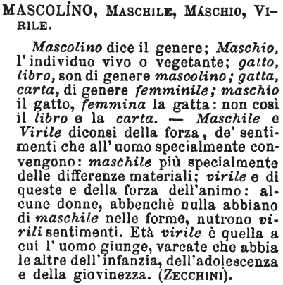 | Mascolino, Maschile, Maschio, Virile - Mascolino dice il genere; maschio l'individuo vivo o vegetante; gatto, libro, son di genere mascolino; gatta, carta, di genere femminile; maschio il gatto, femmina la gatta: non così il libro e la carta. Maschile e virile diconsi della forza, de' sentimenti che all'uomo specialmente convengono: maschile più specialmente delle differenze materiali; virile e di queste e della forza dell'animo: alcune donne, abbenchè nulla abbiano di maschile nelle forme, nutrono virili sentimenti. Età virile è quella a cui l'uomo giunge, varcate che abbia le altre dell'infanzia, dell'adolescenza e della giovinezza. [immagine] |