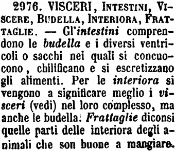 | Visceri, Intestini, Viscere, Budella, Interiora, Frattaglie - Gl'intestini comprendono le budella e i diversi ventricoli o sacchi nei quali si concuocono, chilificano e si ascretizzano gli alimenti. Per le interiora si vengono a significare meglio i visceri (vedi) nel loro complesso, ma anche le budella. Frattaglie diconsi quelle parti delle interiora degli animali che son buone da mangiare. [immagine] |