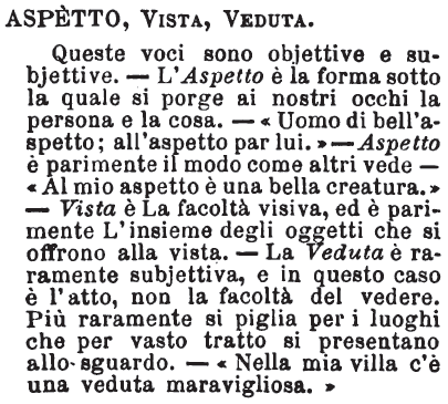 | Aspetto, Vista, Veduta - Queste voci sono objettive e subjettive. - L'Aspetto è la forma sotto la quale si porge ai nostri occhi la persona e la cosa. - «Uomo di bell'aspetto; all'aspetto par lui.» - Aspetto è parimente il modo come altri vede - «Al mio aspetto è una bella creatura.» - Vista è La facoltà visiva, ed è parimente L'insieme degli oggetti che si offrono alla vista. - La Veduta è raramente subjettiva, e in questo caso è l'atto, non la facoltà del vedere. Più raramente si piglia per i luoghi che per vasto tratto si presentano allo sguardo. - «Nella mia villa c'è una veduta maravigliosa.» [immagine] |