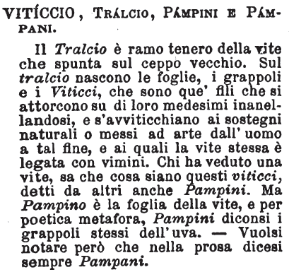 | Viticcio, Tralcio, Pampini e Pampani - Il Tralcio è ramo tenero della vite che spunta sul ceppo vecchio. Sul tralcio nascono le foglie, i grappoli e i Viticci, che sono que' fili che si attorcono su di loro medesimi inanellandosi, e s'avviticchiano ai sostegni naturali o messi ad arte dall'uomo a tal fine, e ai quali la vite stessa è legata con vimini. Chi ha veduto una vite, sa che cosa siano questi viticci, detti da altri anche Pampini. Ma Pampino è la foglia della vite, e per poetica metafora, Pampini diconsi i grappoli stessi dell'uva. - Vuolsi notare però che nella prosa dicesi sempre Pampani. [immagine] |