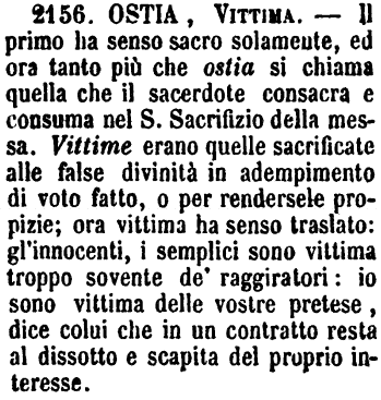 | Ostia, Vittima - Il primo ha senso sacro solamente, ed ora tanto più che ostia si chiama quella che il sacerdote consacra e consuma nel S.Sacrifizio della messa. Vittime erano quelle sacrificate alle false divinità in adempimento di voto fatto, o per rendersele propizie; ora vittima ha senso traslato: gl'innocenti, i semplici sono vittima troppo sovente de' raggiratori: io sono vittima delle vostre pretese, dice colui che in un contratto resta al dissotto e scapita del proprio interesse. [immagine] |