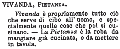 | Vivanda, Pietanza - Vivanda è propriamente tutto ciò che serve di cibo all'uomo, e specialmente quelle cose che poi si cucinano. - La Pietanza è la roba da mangiare già cucinata, e da mettere in tavola. [immagine] |