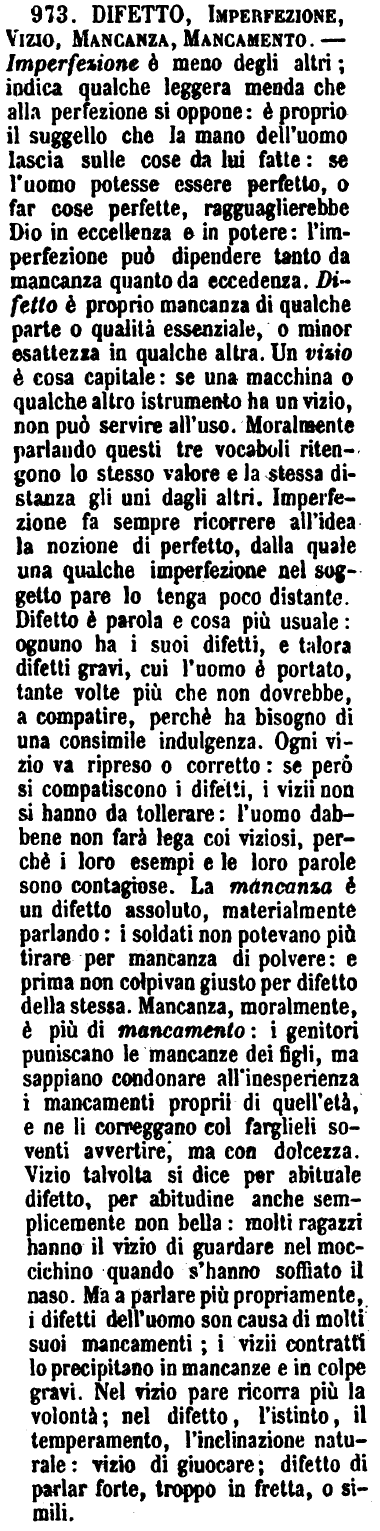 | Difetto, Imperfezione, Vizio, Mancanza, Mancamento - Imperfezione è meno degli altri; indica qualche leggera menda che alla perfezione si oppone: è proprio il suggello che la mano dell'uomo lascia sulle cose da lui fatte: se l'uomo potesse essere perfetto, o far cose perfette, ragguaglierebbe Dio in eccellenza e in potere: l'imperfezione può dipendere tanto da mancanza quanto da eccedenza. Difetto è proprio mancanza di qualche parte o qualità essenziale, o minor esattezza in qualche altra. Un vizio è cosa capitale: se una macchina o qualche altro istrumento ha un vizio, non può servire all'uso. Moralmente parlando questi tre vocaboli ritengono lo stesso valore e la stessa distanza gli uni dagli altri. Imperfezione fa sempre ricorrere all'idea la nozione di perfetto, dalla quale una qualche imperfezione nel soggetto pare lo tenga poco distante. Difetto è parola e cosa più usuale: ognuno ha i suoi difetti, e talora difetti gravi, cui l'uomo è portato, tante volte più che non dovrebbe, a compatire, perchè ha bisogno di una consimile indulgenza. Ogni vizio va ripreso o corretto: se però si compatiscono i difetti, i vizii non si hanno da tollerare: l'uomo dabbene non farà lega coi viziosi, perchè i loro esempi e le loro parole sono contagiose. La mancanza è un difetto assoluto, materialmente parlando: i soldati non potevano più tirare per mancanza di polvere: e prima non colpivan giusto per difetto della stessa. Mancanza, moralmente, è più di mancamento: i genitori puniscano le mancanze dei figli, ma sappiano condonare all'inesperienza i mancamenti proprii di quell'età, e ne li correggano col farglieli soventi avvertire, ma con dolcezza. Vizio talvolta si dice per abituale difetto, per abitudine anche semplicemente non bella: molti ragazzi hanno il vizio di guardare nel moccichino quando s'hanno soffiato il naso. Ma a parlare più propriamente, i difetti dell'uomo son causa di molti suoi mancamenti; i vizii contratti lo precipitano in mancanze e in colpe gravi. Nel vizio pare ricorra più la volontà; nel difetto, l'istinto, il temperamento, l'inclinazione naturale: vizio di giuocare; difetto di parlar forte, troppo in fretta, o simili. [immagine] |