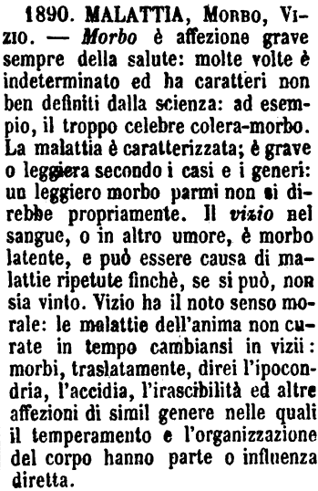 | Malattia, Morbo, Vizio - Morbo è affezione grave sempre della salute: molte volte è indeterminato ed ha caratteri non ben definiti dalla scienza: ad esempio, il troppo celebre colera-morbo. La malattia è caratterizzata; è grave o leggiera secondo i casi e i generi: un leggiero morbo parmi non si direbbe propriamente. Il vizio nel sangue, o in altro umore, è morbo latente, e può essere causa di malattie ripetute finchè, se si può, non sia vinto. Vizio ha il noto senso morale: le malattie dell'anima non curate in tempo cambiansi in vizii: morbi, traslatamente, direi l'ipocondria, l'accidia, l'irascibilità ed altre affezioni di simil genere nelle quali il temperamento e l'organizzazione del corpo hanno parte o influenza diretta. [immagine] |