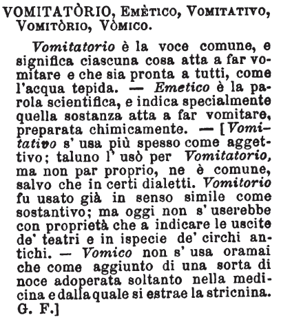 | Vomitatorio, Emetico, Vomitativo, Vomitorio, Vomico - Vomitatorio è la voce comune, e significa ciascuna cosa atta a far vomitare e che sia pronta a tutti, come l'acqua tepida. — Emetico è la parola scientifica, e indica specialmente quella sostanza atta a far vomitare, preparata chimicamente. — [Vomitativo s‘usa più spesso come aggettivo; taluno l'usò per Vomitatorio, ma non par proprio, ne è comune, salvo che in certi dialetti. Vomitorio fu usato già in senso simile come sostantivo; ma oggi non s‘userebbe con proprietà che a indicare le uscite de' teatri e in ispecie de' circhi antichi. — Vomico non s'usa oramai che come aggiunto di una sorta di noce adoperata soltanto nella medicina e dalla quale si estrae la stricnina. G. F.] [immagine] |