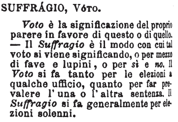| Suffragio, Voto - Voto è la significazione del proprio parere in favore di questo o di quello. - Il Suffragio è il modo con cui tal voto si viene significando, o per mezzo di fave e lupini, o per sì e no. Il Voto si fa tanto per le elezioni a qualche ufficio, quanto per far prevalere l'una o l'altra sentenza. Il Suffragio si fa generalmente per elezioni solenni. [immagine] |