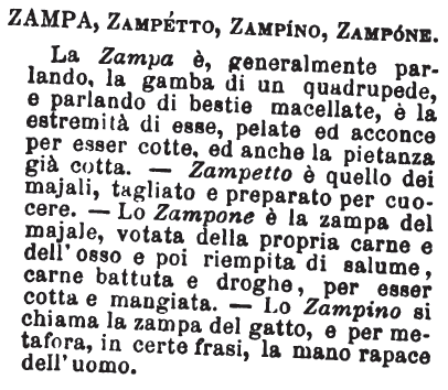 | Zampa, Zampetto, Zampino, Zampone - La Zampa è, generalmente parlando, la gamba di un quadrupede, e parlando di bestie macellate, è la estremità di esse, pelate ed acconce per esser cotte, ed anche la pietanza già cotta. - Zampetto è quello dei majali, tagliato e preparato per cuocere. - Lo Zampone è la zampa del majale, votata della propria carne e dell'osso e poi riempita di salume, carne battuta e droghe, per esser cotta e mangiata. - Lo Zampino si chiama la zampa del gatto, e per metafora, in certe frasi, la mano rapace dell'uomo. [immagine] |