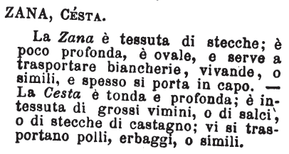 | Zana, Cesta - La Zana è tessuta di stecche; è poco profonda, è ovale, e serve a trasportare biancherie, vivande, o simili, e spesso si porta in capo. - La Cesta è tonda e profonda; è intessuta di grossi vimini, o di salci, o di stecche di castagno; vi si trasportano polli, erbaggi, o simili. [immagine] |