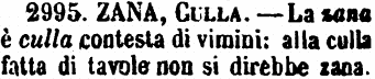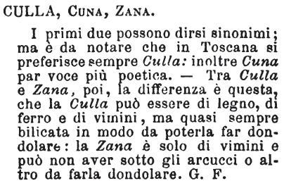 | Culla, Cuna, Zana - I primi due possono dirsi sinonimi; ma è da notare che in Toscana si preferisce sempre Culla: inoltre Cuna par voce più poetica. - Tra Culla e Zana, poi, la differenza è questa, che la Culla può essere di legno, di ferro e di vimini, ma quasi sempre bilicata in modo da poterla far dondolare: la Zana è solo di vimini e può non aver sotto gli arcucci o altro da farla dondolare. G. F. [immagine] |