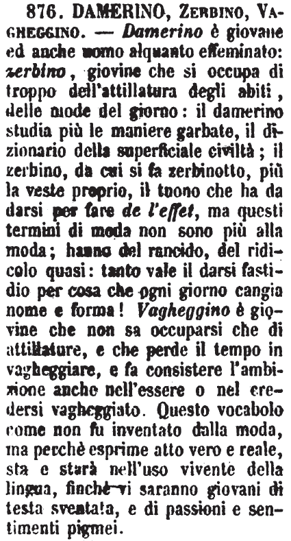 | Damerino, Zerbino, Vagheggino - Damerino è giovane ed anche uomo alquanto effeminato: zerbino, giovine che si occupa di troppo dell'attillatura degli abiti, delle mode del giorno: il damerino studia più le maniere garbate, il dizionario della superficiale civiltà; il zerbino, da cui si fa zerbinotto, più la veste proprio, il tuono che ha da darsi per fare de l'effet, ma questi termini di moda non sono più alla moda; hanno del rancido, del ridicolo quasi: tanto vale il darsi fastidio per cosa che ogni giorno cangia nome e forma! Vagheggino è giovine che non sa occuparsi che di attillature, e che perde il tempo in vagheggiare, e fa consistere l'ambizione anche nell'essere o nel credersi vagheggiato. Questo vocabolo come non fu inventato dalla moda, ma perchè esprime atto vero e reale, sta e starà nell'uso vivente della lingua, finchè vi saranno giovani di testa sventata, e di passioni e sentimenti pigmei. [immagine] |