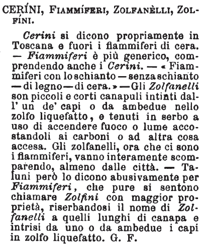 | Cerini, Fiammiferi, Zolfanelli, Zolfini - Cerini si dicono propriamente in Toscana e fuori i fiammiferi di cera. - Fiammiferi è più generico, comprendendo anche i Cerini. - «Fiammiferi con lo schianto - senza schianto - di legno - di cera.» - Gli Zolfanelli son piccoli e corti canapuli intinti dall'un de' capi o da ambedue nello zolfo liquefatto, e tenuti in serbo a uso di accendere fuoco o lume accostandoli ai carboni o ad altra cosa accesa. Gli zolfanelli, ora che ci sono i fiammiferi, vanno interamente scomparendo, almeno dalle città. - Taluni però lo dicono abusivamente per Fiammiferi, che pure si sentono chiamare Zolfini con maggior proprietà, riserbandosi il nome di Zolfanelli a quelli lunghi di canapa e intrisi da uno o da ambedue i capi in zolfo liquefatto. G. F. [immagine] |