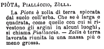 | Piota, Piallaccio, Zolla - La Piota è zolla di terra spiccata dal suolo coll'erba. Che se è larga e quadrata, come quelle con cui si rivestono gli argini in alcuni luoghi, si chiama Piallaccio. - Zolla è terra lavorata riunita in una massa più o meno grossa. [immagine] |