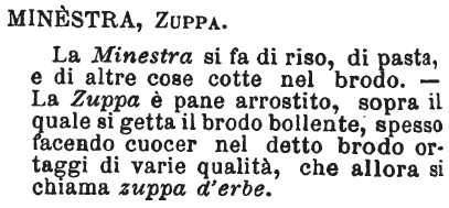 | Minestra, Zuppa - La Minestra si fa di riso, di pasta, e di altre cose cotte nel brodo. - La Zuppa è pane arrostito, sopra il quale si getta il brodo bollente, spesso facendo cuocer nel detto brodo ortaggi di varie qualità, che allora si chiama zuppa d'erbe. [immagine] |